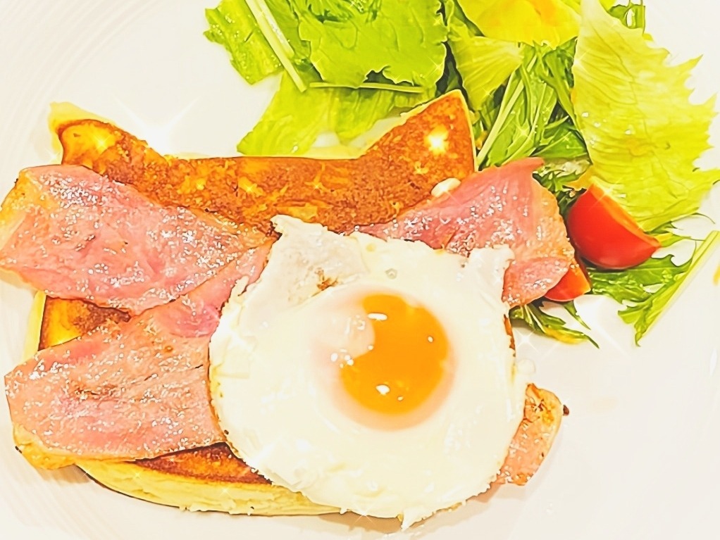 ジューシーなベーコンと可愛いねこ型の半熟目玉焼きをトッピング♥
