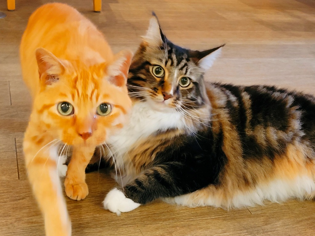 メインクーンのおもちくんと茶トラ猫のきなこくんが、自由気ままにのんびりと過ごしながらみなさまのご来店をお待ちしております。