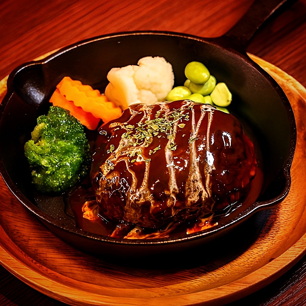 ふっくらジューシーに焼き上げた自家製ハンバーグに、甘口の濃厚デミグラスソースをたっぷり!!