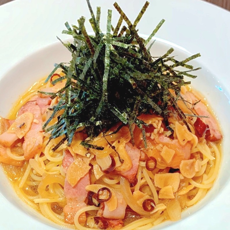 これでもか!!というほどのフライドガーリックがたっぷり入った、バター醬油風味の和風パスタ♥